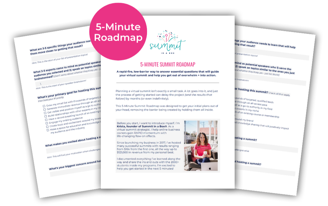 The 5-Minute Summit Roadmap leads you through the 7 essential questions that will guide the rest of your summit planning process and help you finally start making meaningful progress.
